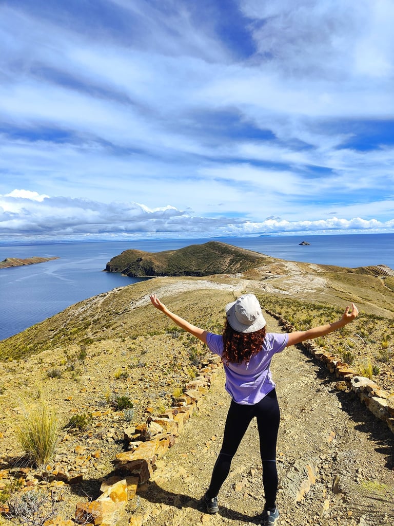 Si prosegue il cammino, che gradualmente sale regalando alla vista scenari incantevoli sul lago, sulla vicina Isla de la Luna e sulla Cordillera delle Ande che svetta sullo sfondo con i suoi maestosi e altissimi pinnacoli innevati.